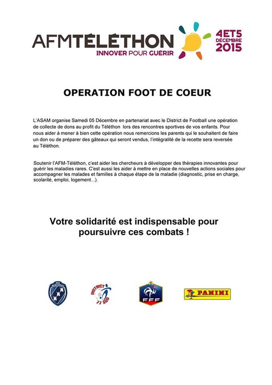L'ensemble des licenciés U6 jusqu'aux Vétérants, dirigeants et parents du club sont conviés pour une opération de collecte au profit du Téléthon Samedi 5 décembre à partir de 14h au stade CHALMEAU.