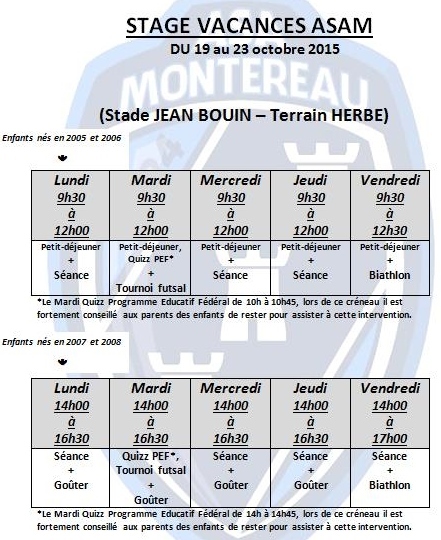 L'ASAM organise un stage lors des vacances de la Toussaint (du Lundi 19 au Vendredi 23 octobre 2015) au stade JEAN BOUIN (Terrain Herbe).