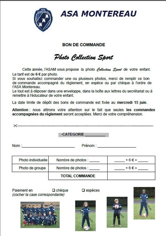 Cette saison, l'ASAM vous propose la photo "Collection Sport" de votre enfant. Ci-joint le bon de commande à retourner au secrétariat ou à son éducateur.