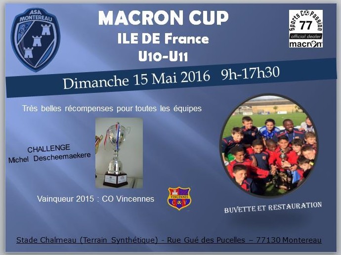 L'ASAM organise cette année la première édition du tournoi "MACRON CUP" destiné aux catégories U10 et U11 qui se déroulera le DIMANCHE 15 MAI 2016 sur les installations du STADE CHALMEAU.