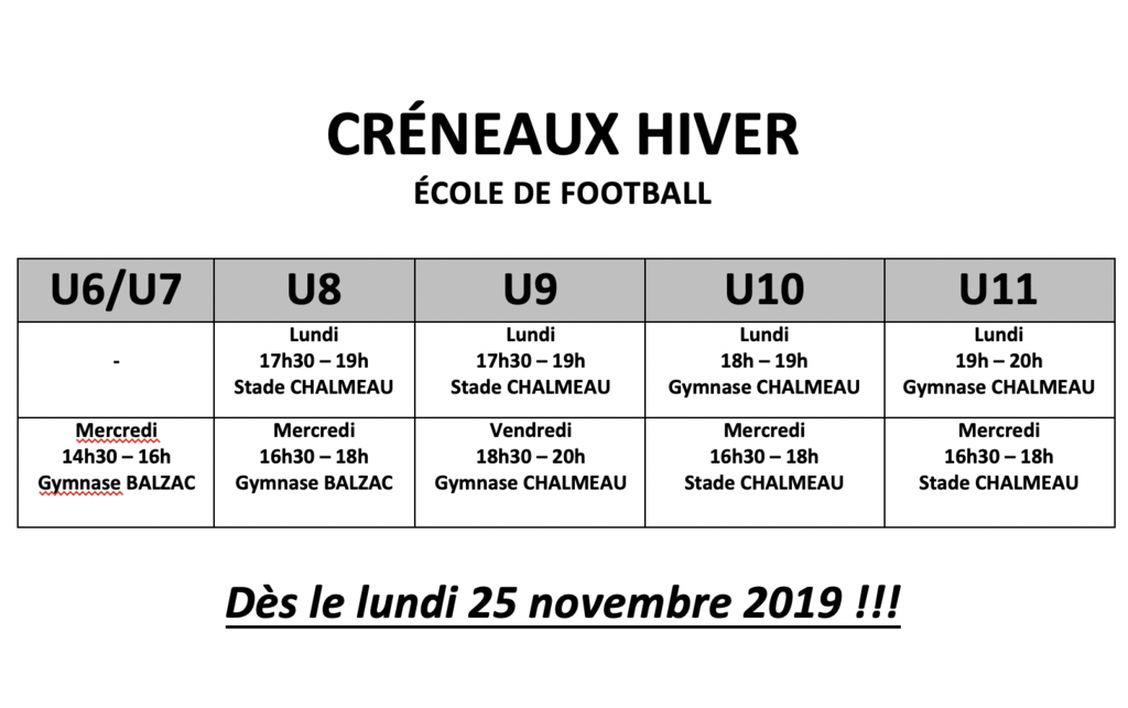 Afin d'assurer nos séances habituelles nous passons dès le lundi 25 novembre sur les créneaux ci-joint !